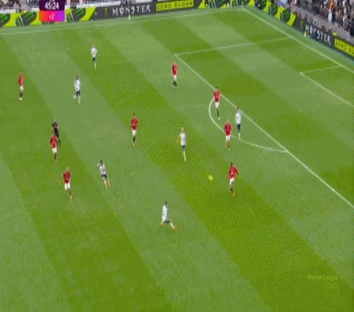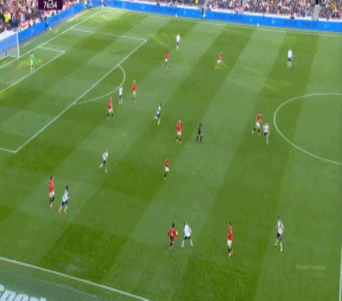 虽然曼联在进攻端的布置在理论上稍有问题,库尼亚和阿玛德-迪亚洛在各自位置上的表现不足很清晰,导致上半场的反制能力没能拔到理论上的最高值,但曼联还是先进一球,而且线路上恰好是右路的阿玛德-迪亚洛传给左路的姆贝乌莫: