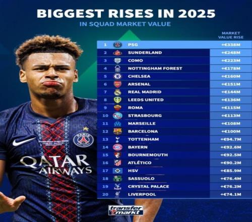 2025俱乐部身价涨幅榜:巴黎+3.38亿领跑
