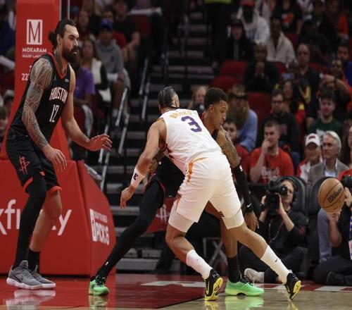 末节初段,谢泼德中投完成反超,狄龙中投命中,史密斯连得5分打停太阳。回到比赛,布克中距离止血,杜兰特回敬一个,奥尼尔三分再来。伊森自投自补,双方又是对攻大战,打得难解难分。谢泼德和杜兰特连续中投,史密斯两罚一中,火箭领先到了7分。但布克挺身而出,连投带罚,回敬一波6-0追到只差1分,火箭暂停。结果暂停以后,阿门直接一个失误,狄龙中投反超,布克罚球以后,阿门2+1追平。然后火箭一直打铁,布克最后一攻三不沾。火箭暂停以后,杜兰特接球直接三分拔起逆天绝杀!